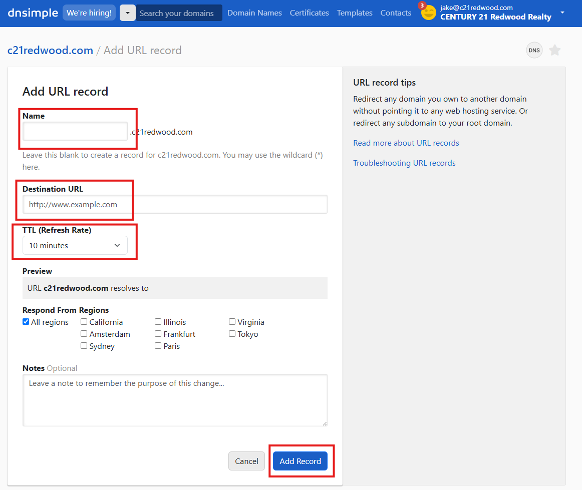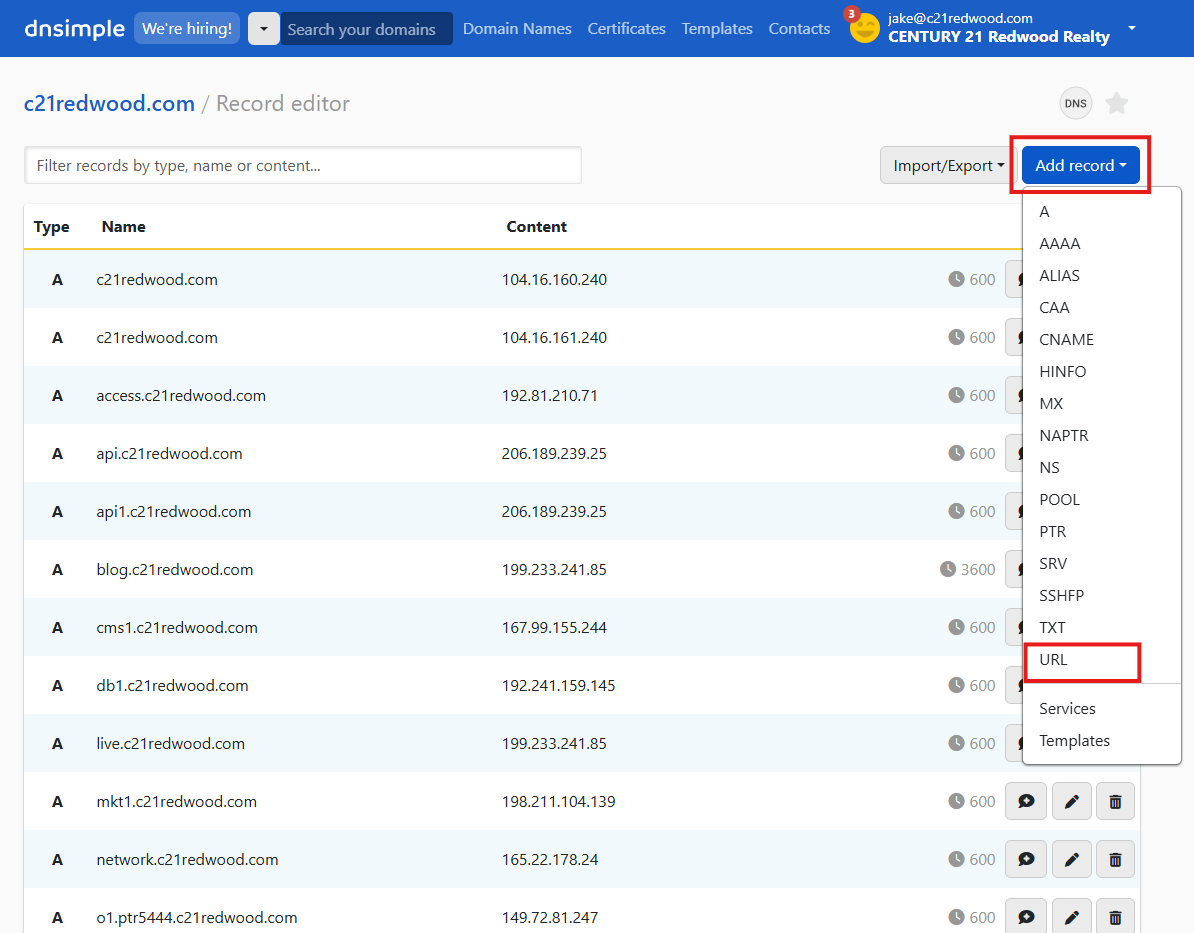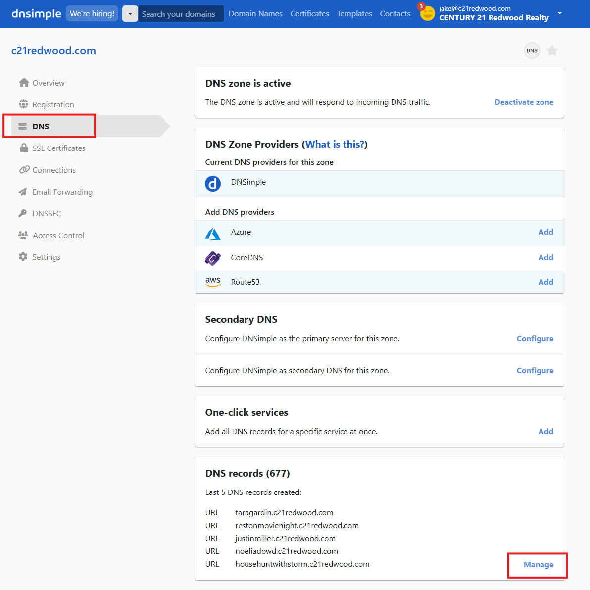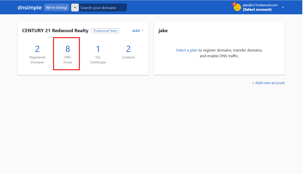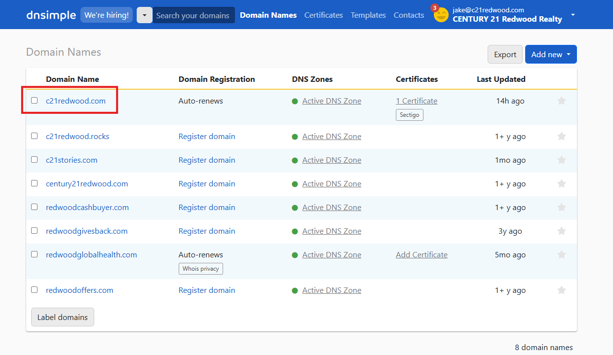 - Login to DNSimple. Click the DNS Zones then select the c21redwood.com domain.