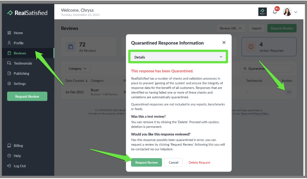 To view your quarantined items, go to the Reviews section of your dashboard. You can use the search tab or filter your transactions easily under the Action Required tab where you will see all quarantined responses.