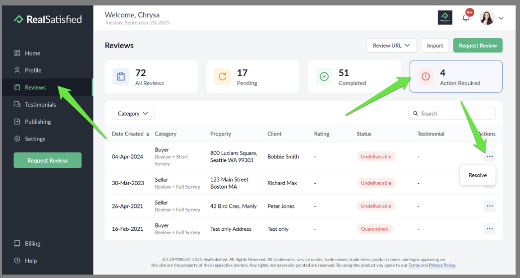 - Invitation Undeliverable – invitations that bounced due to incorrect/invalid email address or was blocked by your client’s email provider. To resolve this, go to your 'Reviews' section, select 'Action Required', click the 'Action' button, then select 'Resolve'. A pop-up window will appear, allowing you to change the email address and Resend the survey.