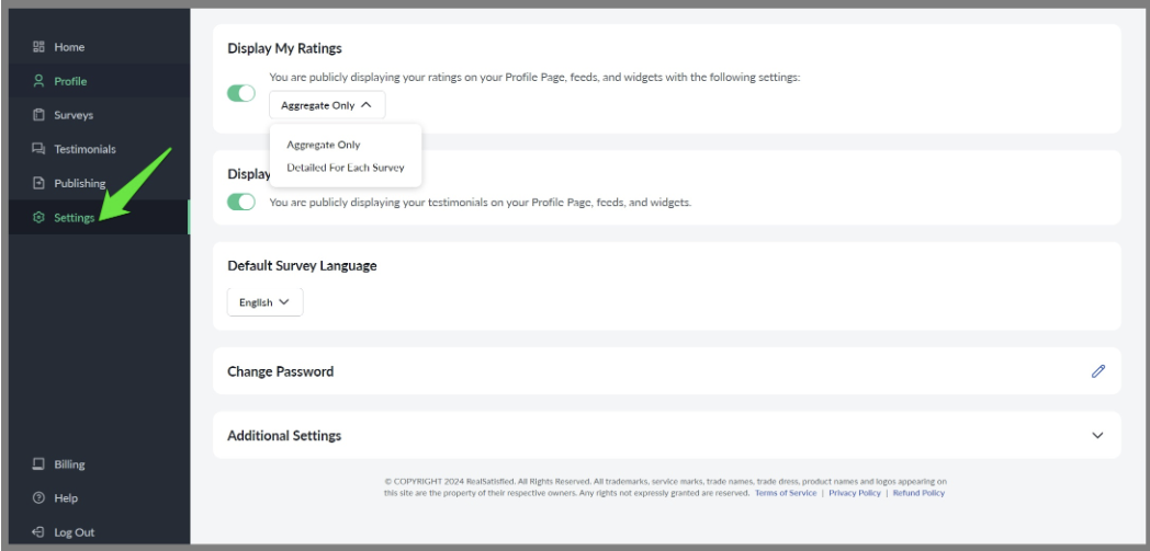 In your profile settings, you may choose to display your ratings in several different formats, or you can choose to not display them at all. If you choose to display your ratings, you may choose to display “Your Aggregate Ratings Only” or you may choose to display “Detailed Ratings For Each Survey.”