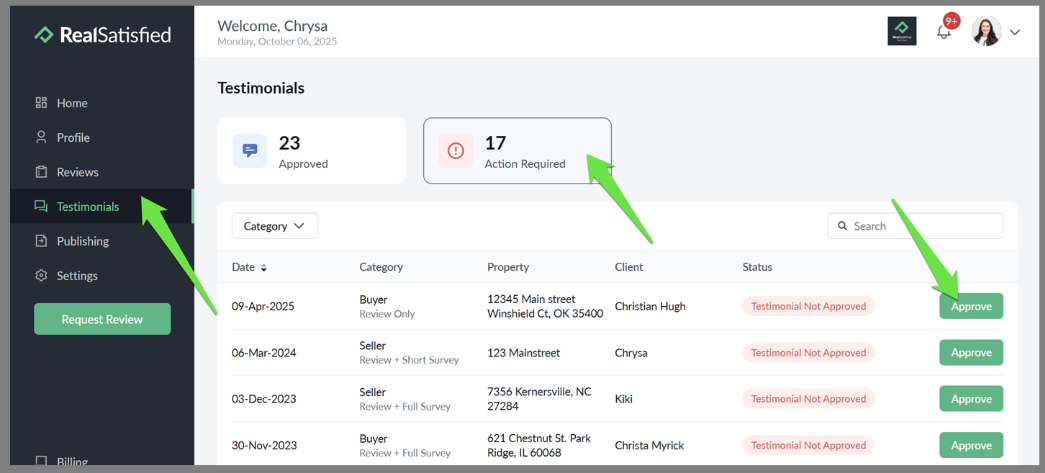 You may also choose to display your testimonials or hide it. When a survey is completed with a testimonial, it must be approved before it appears on your public profile page. To approve the testimonial, go to the ‘Testimonials’ section of your Agent Dashboard then choose the 'Action Required' tab. Click the 'Approve' button next to the testimonial you would like to review.