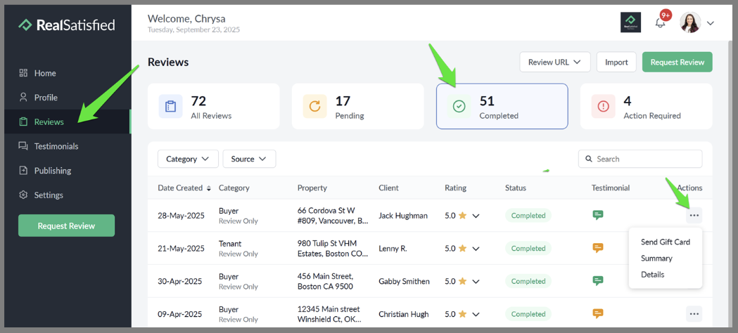 RealSatisfied is an agent evaluation company that syndicates and publishes client reviews. RealSatisfied surveys are automatically sent to your client after a transaction has closed and if you have checked the box on the coversheet to send the survey.