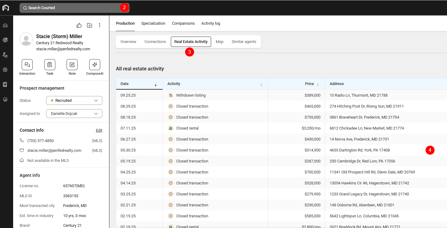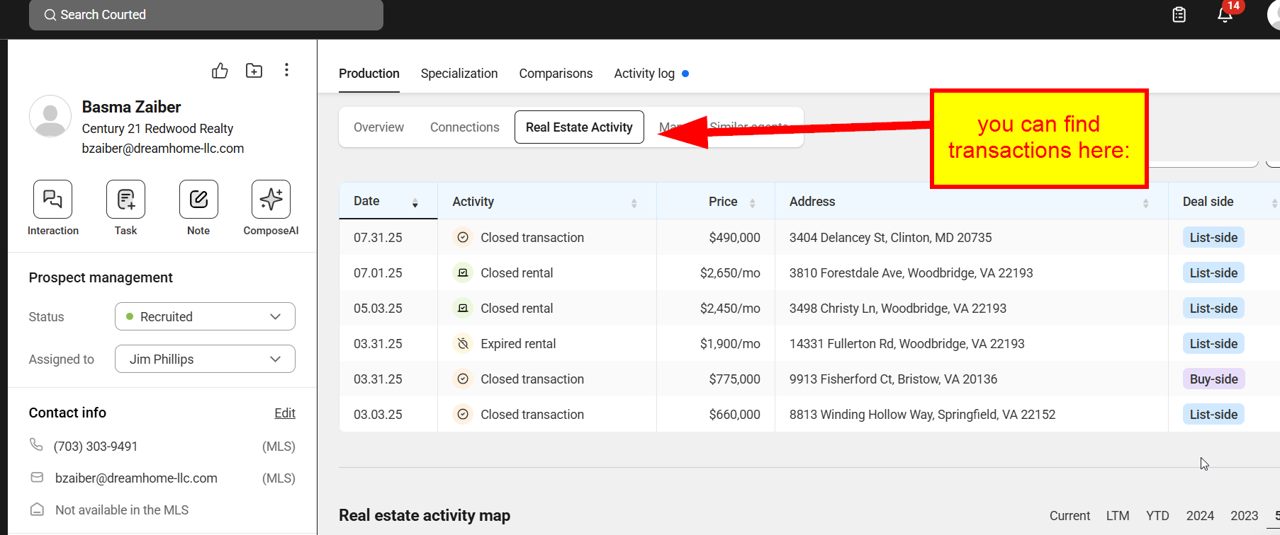 - Navigate to Real Estate Activity tab and review the list to confirm the agent's closings for the calendar year.