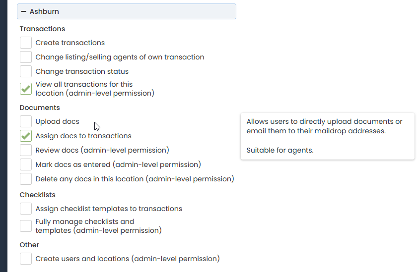 - Determine the permissions required and check the boxes next to the permissions you would like to grant based on the user’s role and office location.