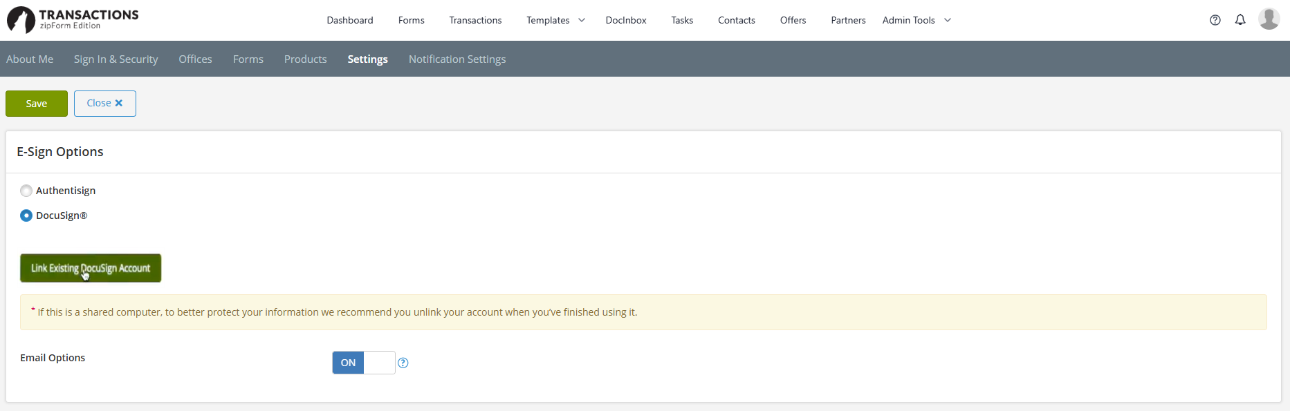 Under “E-Signature Options” select DocuSign and then “Link Existing DocuSign Account”