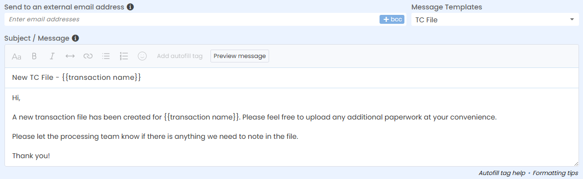 8. Send email to TC to confirm file has been created and include missing paperwork. All communication correspondence should go through the transaction coordinator, not the agent.