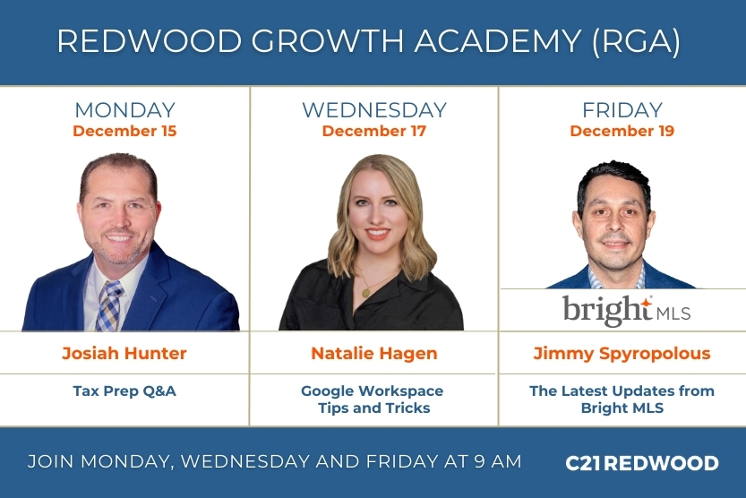 RGA will have some great hosts next week to discuss MLS, tax strategies, and Google Workspace. Be sure to tune in Monday, Wednesday, and Friday at 9 AM here and help us make RGA better by giving us your thoughts in this survey. We’d love to hear from you!